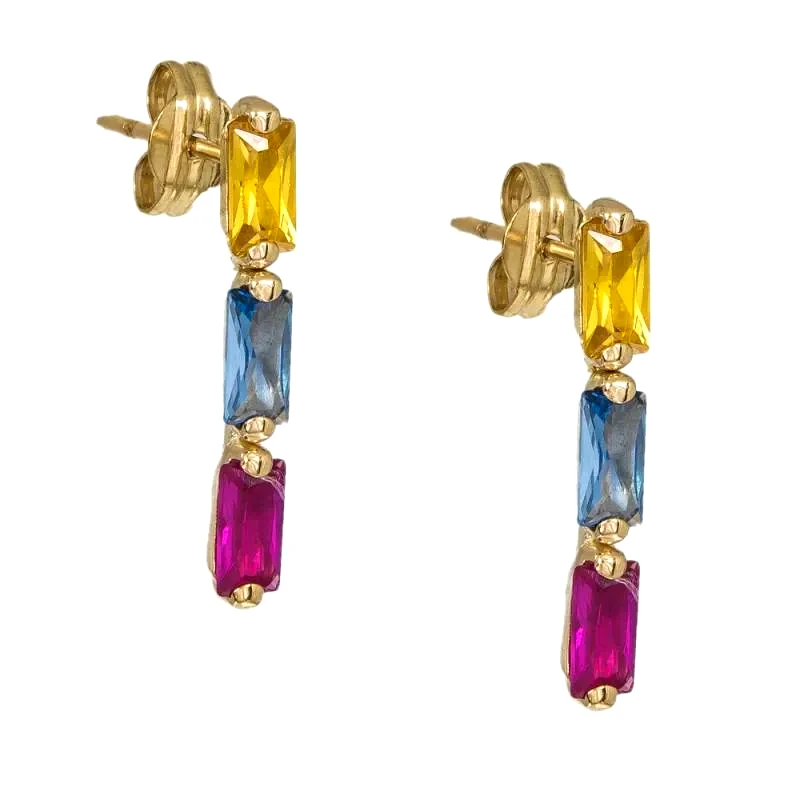 Χρυσά γυναικεία σκουλαρίκια 9 καρατίων, με ορθογώνιες πέτρες σε κίτρινο, μπλε και κόκκινο χρώμα να τα κοσμούν, για να χαρίσετε λάμψη στην καθημερινή σας εμφάνιση!