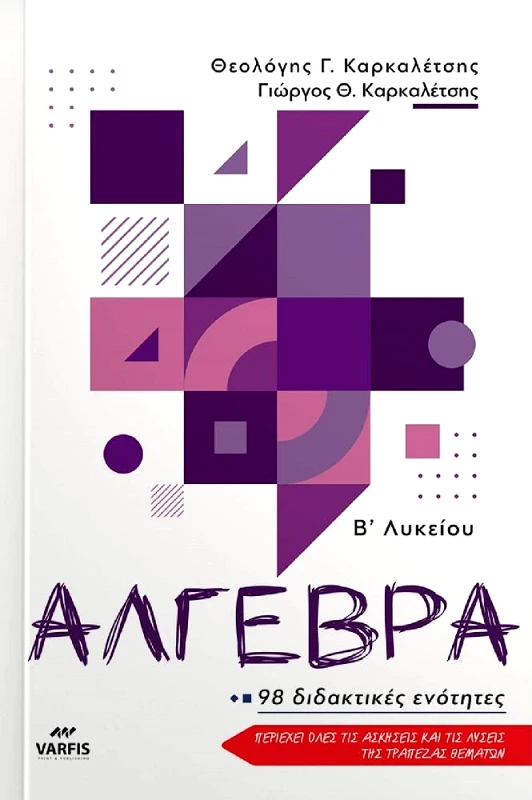 Το βιβλίο περιέχει όλη τη ύλη που αντιστοιχεί στο μάθημα Άλγεβρα Γενικής Παιδείας της Β&prime ; Λυκείου των Γενικών Λυκείων και των Επαγγελματικών Λυκείων. Η δομή του βιβλίου:Το βιβλίο χωρίζεται σε 98 διδακτικές ενότητες, δηλαδή, 98 διακριτές ενότητες που η κάθε μία μπορεί να αντιστοιχεί σε μία διδακτική ώρα μαθήματος.Κάθε διδακτική ενότητα περιέχει τα περισσότερα κάθε φορά από τα παρακάτω● Θεωρία● Ερωτήσεις κατανόησης● Μία τουλάχιστον, υποδειγματικά, λυμένη άσκηση● Ασκήσεις για λύση που καλύπτουν όλη την αντίστοιχη θεωρία της ενότητας● Επεκτάσεις με ασκήσεις που είναι πιο δύσκολες από τις ασκήσεις για λύση χωρίς όμως να προϋποθέτουν γνώση επιπλέον θεωρίας● Προβλήματα, δηλαδή θέματα στα οποία απαιτείται να γίνει ένα πρώτο βήμα ώστε να μετατρέψουμε τα δεδομένα σε μαθηματική άσκηση Οι ασκήσεις αντλήθηκαν από● την Τράπεζα θεμάτων (περιέχονται ουσιαστικά όλες οι ασκήσεις της Τράπεζας θεμάτων και κάθε αντίστοιχη άσκηση έχει την ένδειξη του αντίστοιχου αριθμού της)● μαθηματικούς διαγωνισμούς● γνωστά βοηθήματα που κυκλοφορούν και που αναφέρονται στη Βιβλιογραφία● το διαδίκτυο● προσωπικό αρχείο Στο τέλος του βιβλίου περιέχονται● αναλυτικές προτεινόμενες λύσεις όλων των ασκήσεων.● επαναληπτικά διαγωνίσματα (δύο σε κάθε κεφάλαιο και δύο γενικά) Το βιβλίο αυτό έχει δοκιμαστεί πολλά χρόνια μέσα στα τμήματα της Β' Λυκείου και αποτελεί πλέον μία ολοκληρωμένη διδακτική πρόταση.