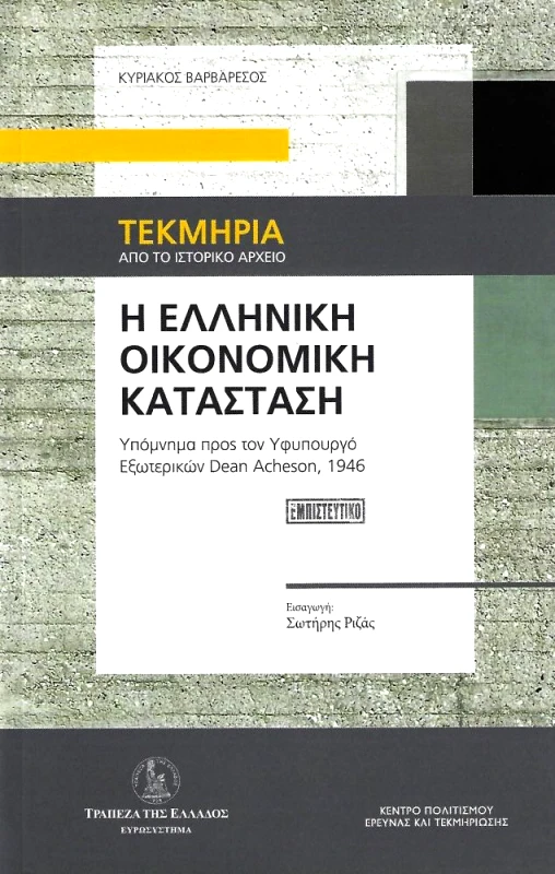 Ο Κυριάκος Βαρβαρέσος είναι κυρίως γνωστός για την περίφημη "Έκθεση επί του οικονομικού προβλήματος της Ελλάδος", ένα κείμενο που έγραψε το 1952. Σε αυτό το βιβλίο δημοσιεύεται ένα άλλο, λιγότερο γνωστό κείμενό του, με το οποίο αποπειράθηκε να προσεγγίσει τα καίρια προβλήματα - οικονομικά, κοινωνικά και πολιτικά - της Ελλάδας το καλοκαίρι του 1946. Το υπόμνημα συντάχθηκε με τη βοήθεια της πολύτιμης συνεργάτιδάς του Ρένας Ζαφειρίου, μετά από σχετικό αίτημα του Αμερικανού Υφυπουργού Dean Acheson προς τον Bαρβαρέσο, τον Μάρτιο του 1946.Επρόκειτο για μια μεταιχμιακή εποχή, κατά την οποία η χώρα διολίσθαινε από τη συνθήκη της Βάρκιζας, που είχε προς στιγμήν κλείσει την ένοπλη αναμέτρηση των Δεκεμβριανών, προς τον εμφύλιο πόλεμο και ο κόσμος μετέβαινε από το τέλος του Β΄ Παγκοσμίου Πολέμου στον Ψυχρό Πόλεμο. Το υπόμνημα είναι μια αποτύπωση των αντιτιθέμενων ροπών, των διακυβευμάτων και των πολιτικών και οικονομικών εξελίξεων, καθώς και των εναλλακτικών που ενδεχομένως υπήρχαν, αλλά δεν επικράτησαν.