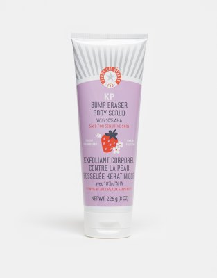 Face + Body by First Aid Beauty The ultimate body-buffer Body scrub Designed to sweep away dry rough bumps associated with Keratosis pilaris and strawberry skin to reveal visibly smoother healthier and radiant skin Suitable for all skin types Formulated with pumice buffing beads to aid in removing dead skin cells and reveal brighter looking skin Contains glycolic and lactic acids to exfoliate the skin and help it appear brighter and improve texture Infused with bisabolol to help soothe and calm the skin Vitamin E works to condition and soothe the skin Strawberry scent Product is non-returnable for hygiene reasons