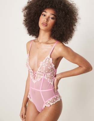 Tops by ASOS DESIGN Floral embroidery Plunge neck Non-padded cups Lace-up detail Adjustable straps Hook-and-eye fastening Cut-out back Brazilian cut Nipple covers not included