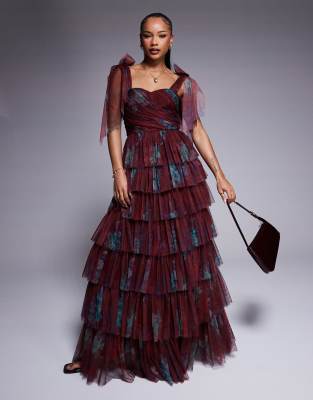 Petite by Lace & Beads Petite Make an entrance (and an exit) Floral design Sweetheart neck Tie straps Zip-side fastening Tiered skirt Regular fit