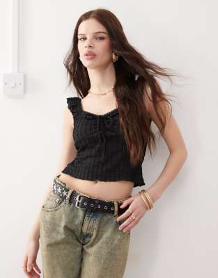 Tops by Reclaimed Vintage Exclusive to ASOS Textured finish Scoop neck Tie front Frill straps Cropped length Regular fit