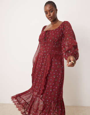 Dresses by ASOS Curve Out of screenshots into basket Floral design Square neck Blouson sleeves Lace inserts Zip-back fastening Regular fit
