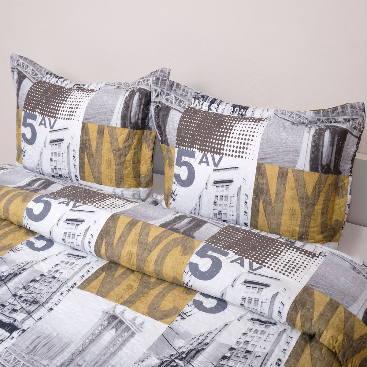 Υπέρδιπλο κουβερλί με patchwork σχέδιο σε γκρι αποχρώσεις και λευκές-μουσταρδί λεπτομέρειες από την εταιρία Viopros. Η σύνθεσή του εξωτερικού υφάσματος είναι από 100% microfiber που το καθιστά ιδιαίτερα απαλό ενώ η γέμιση είναι από πολυεστερική βάτα, βάρους 150gsm. Ιδανικό σκέπασμα για τους καλοκαιρινούς-ανοιξιάτικους μήνες.