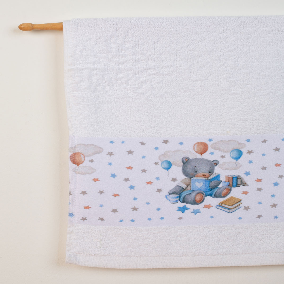 Σετ βρεφικές πετσέτες μπάνιου από την εταιρεία Dimcol, σε λευκό χρώμα με αρκουδάκι στο σχέδιο. Είναι κατασκευασμένες από 100% βαμβάκι βάρους 400γραμ./τ.μ. Έχουν υφασμάτινη φάσα με ψηφιακά τυπωμένα χρωματιστά σχέδια. Ξεχωρίζουν για την υψηλή τους απορροφητικότητα και την εξαιρετική τους ποιότητα. Συσκευασία κουτί.
