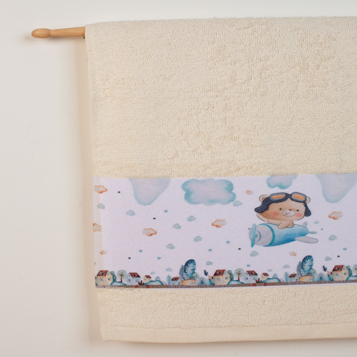Σετ βρεφικές πετσέτες μπάνιου από την εταιρεία Dimcol, σε μπεζ χρώμα με αρκουδάκι πιλότο στο σχέδιο. Είναι κατασκευασμένες από 100% βαμβάκι βάρους 400γραμ./τ.μ. Έχουν υφασμάτινη φάσα με ψηφιακά τυπωμένα χρωματιστά σχέδια. Ξεχωρίζουν για την υψηλή τους απορροφητικότητα και την εξαιρετική τους ποιότητα. Συσκευασία κουτί.