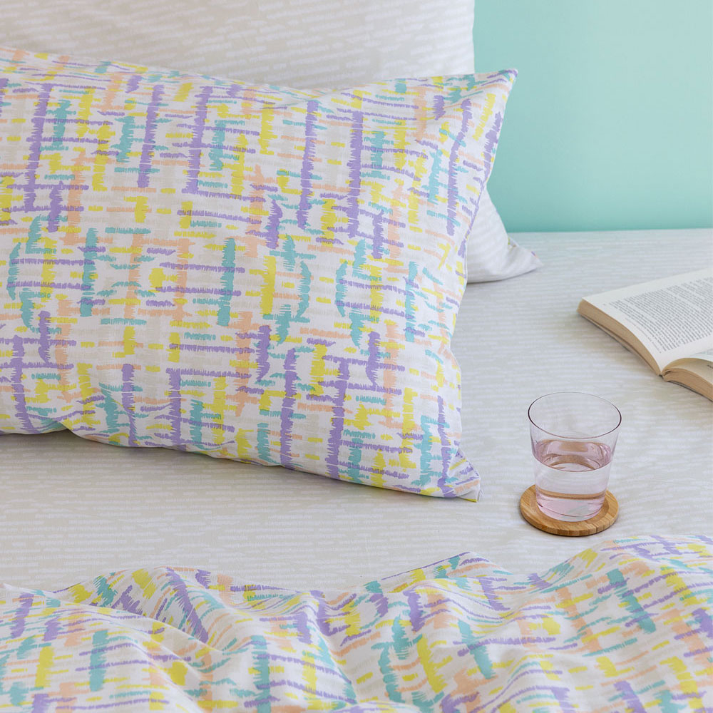 Σετ γίγας σεντόνια της εταιρείας Palamaiki με μοντέρνο σχέδιο σε λιλά-πολύχρωμες αποχρώσεις. Το κατωσέντονο έχει διακριτικό σχέδιο σε λευκό-εκρού χρώμα. Το ύφασμα είναι 100% βαμβάκι 144 κλωστών μαλακό και ανθεκτικό. Οι μαξιλαροθήκες είναι φάκελος διπλής όψης με την μία πλευρά να έχει το σχέδιο του πανωσέντονου και την άλλη το σχέδιο του κατωσέντονου.