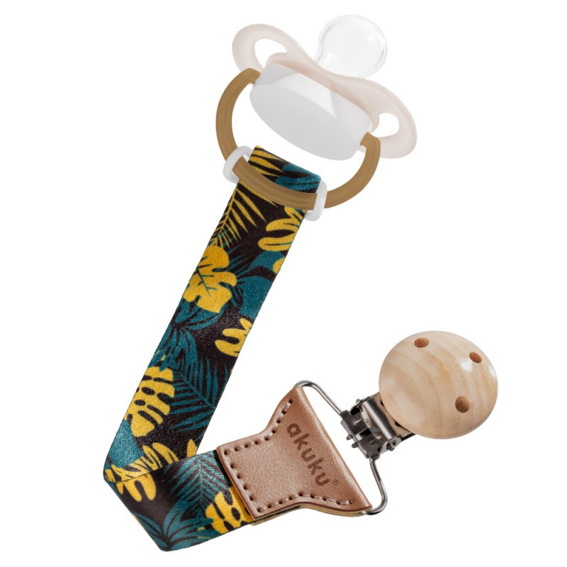 Κλιπ πιπίλας σε πράσινο χρώμα, με χακί-βεραμάν λεπτομέρειες και τρόπικαλ σχέδιο από την εταιρεία Akuku. Θα σας βοηθήσει για να είστε πάντα σίγουρες ότι το μωρό σας έχει πάντα καθαρή πιπίλα. Ο ελαστικός δακτύλιος σιλικόνης μπορεί να ενωθεί με σχεδόν οποιοδήποτε είδος πιπίλας στην αγορά, όπως και το μεταλλικό κλιπ του που δεν περιέχει νικέλιο μπορεί να φορεθεί σε όλα τα ρούχα.