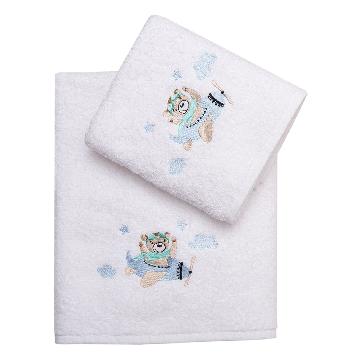 Πετσέτες μπάνιου του μωρού σας, σε λευκό χρώμα, γαλάζιο περιμετρικό ρέλι και κεντητό σχέδιο ζωάκια. Κατασκευασμένες από πετσετέ 100% βαμβακερό ύφασμα που τις καθιστά αρκετά απορροφητικές. Συσκευασία κουτί.