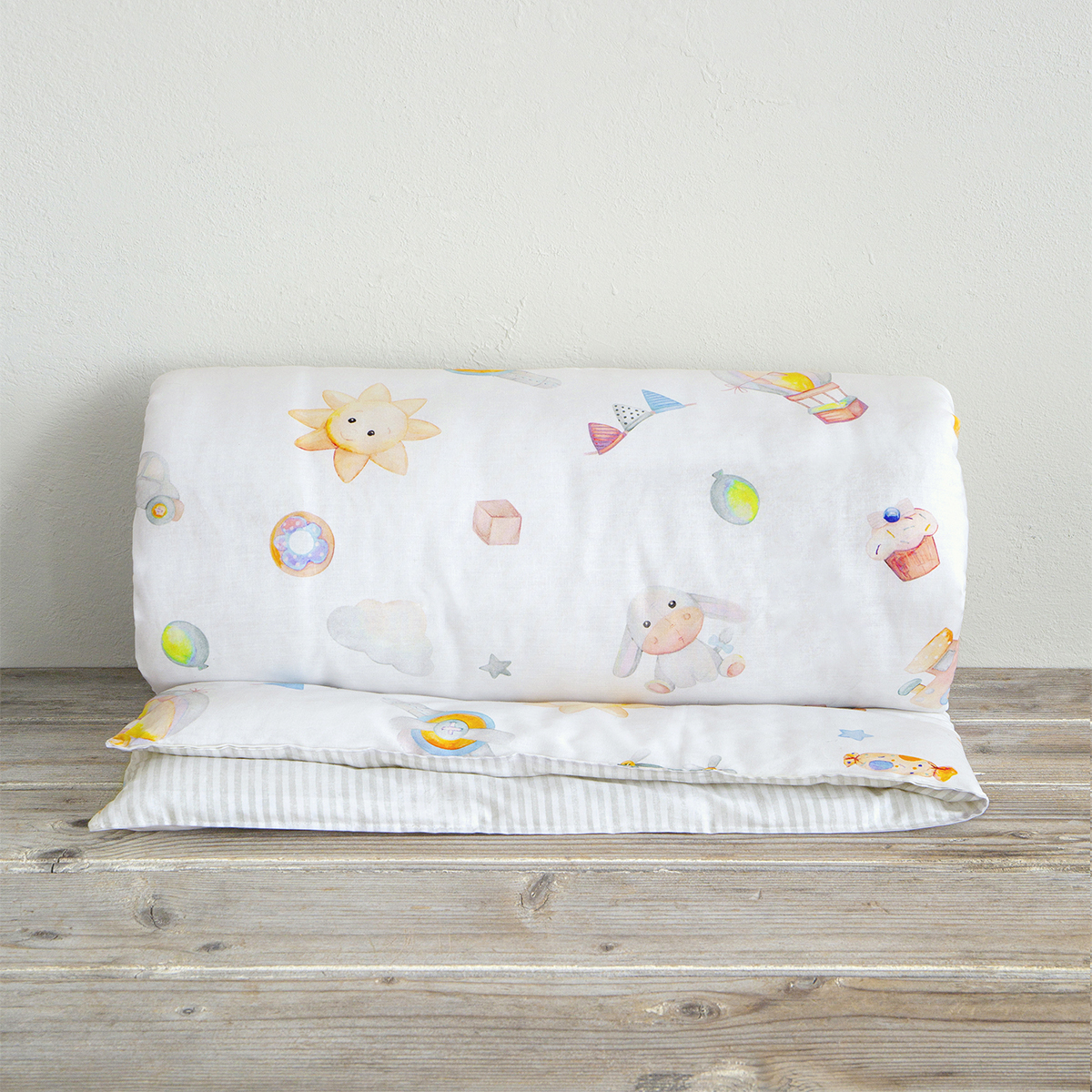 Βρεφικό κουβερλί για την κούνια από την εταιρεία Nima. Σε λευκό χρώμα με πολύχρωμες λεπτομέρειες και σχέδιο με ζωάκια. Το εξωτερικό ύφασμα είναι 100% βαμβάκι 144 κλωστών, που προσφέρει απαλή υφή και ανθεκτικότητα. Εσωτερικά έχει λεπτή πολυεστερική βάτα, που το καθιστά ιδανικό σκέπασμα για τους ανοιξιάτικους και καλοκαιρινούς μήνες. Είναι διπλής όψης, η μία μεριά έχει το σχέδιο του πανωσέντονου και η άλλη το σχέδιο του κατωσέντονου.