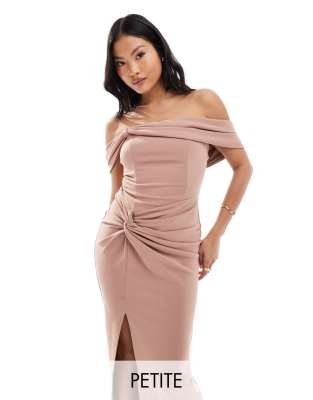 Petite by TFNC Petite Bride approved Bardot neck Sleeveless style Knot detail Zip-back fastening Front split Regular fit