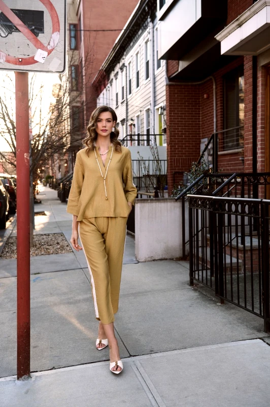 Ψηλόμεσο παντελόνι με λάστιχο στη μέση. Λεπτομέρεια με εκρού ρέλι και στρας στις πλαϊνές ραφές. Πλαϊνές κρυφές τσέπες. Ίσιο μπατζάκι με στρογγυλεμμένο τελείωμα στο πλάι.Μάκρος: 95cm. Ελληνικής κατασκευής Designed by Kellys Σύνθεση: 83% Ρεγιόν 17% Νάυλον