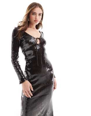 Dresses by Bardot Dancefloor dress code Sequin embellishment Scoop neck Tie keyhole front Long sleeves Open tie back Zip-back fastening Regular fit