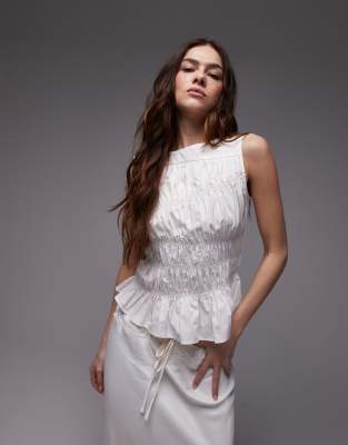 Tops by Topshop Boat neck Sleeveless style Shirred details Ruffle hem Slim fit