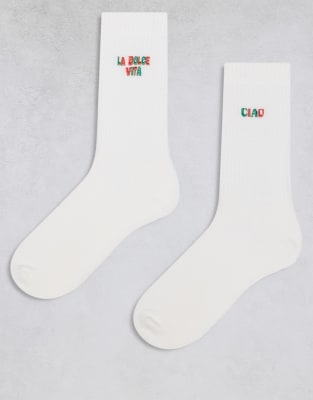 Επισκέψου το κατάστημα Asos για να δεις περισσότερες λεπτομέρειες και φωτογραφίες για το ASOS DESIGN 2 pack socks with ciao and dolce vita graphic in ecru-White. Για αγορά του ASOS DESIGN 2 pack socks with ciao and dolce vita graphic in ecru-White πρέπει να επισκεφτείς το κατάστημα Asos.