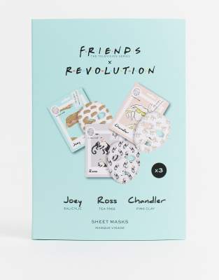Face mask set by Revolution Part of the Revolution X Friends collection Contains three sheet masks In the style of Joey Ross and Chandler Joey mask is enriched with salicylic acid which works to penetrate skin to exfoliate and unclog pores resulting in a reduction of blackheads blemishes and redness Ross mask contains antibacterial tea tree which reduces breakouts and regulates excess oils while also soothing and reducing inflammation Chandler mask is formulated with pink clay which helps to absorb excess sebum and dirt from the pores to leave skin feeling cleansed and balanced Presented in a branded gift pouch Product is non-returnable for hygiene reasons