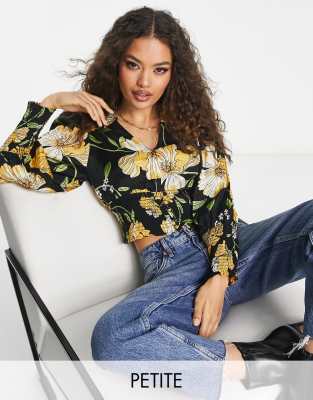 Tops by River Island Petite Love at first scroll Floral design V-neck Long sleeves Shirred hem Slim fit