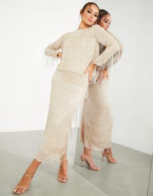 Co-ords by ASOS EDITION Add-to-bag material Crew neck Long sleeves Bead fringing All-over sequin embellishment Open back Concealed closure Regular fit