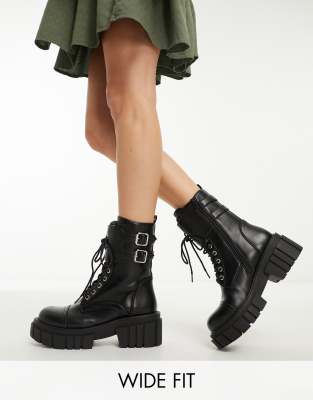 Shoes by Glamorous Wide Fit Time for a reboot Pull tab for easy entry Lace-up fastening Buckle details Round toe Chunky sole Mid block heel Wide fit