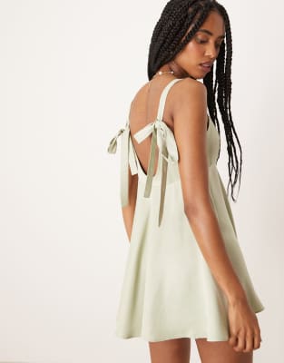 Επισκέψου το κατάστημα Asos για να δεις περισσότερες λεπτομέρειες και φωτογραφίες για το ASOS DESIGN satin bow back a line mini dress in sage-Green. Για αγορά του ASOS DESIGN satin bow back a line mini dress in sage-Green πρέπει να επισκεφτείς το κατάστημα Asos.