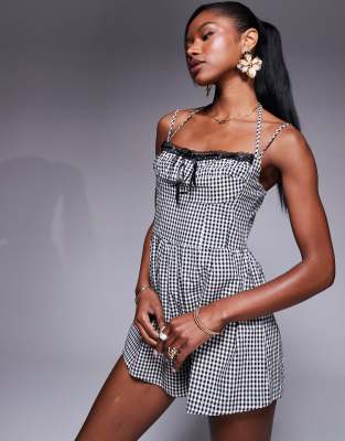 Jumpsuits & Playsuits by Princess Polly Gingham design Square neck Adjustable straps Lace trim Zip-back fastening Regular fit