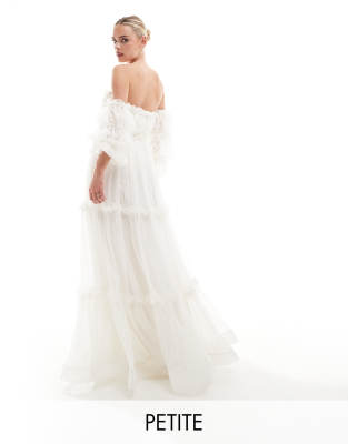 Petite by Lace & Beads Petite Let's hear it for the dress Bandeau style Puff sleeves Ruffle trims Regular fit