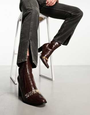 Επισκέψου το κατάστημα Asos για να δεις περισσότερες λεπτομέρειες και φωτογραφίες για το ASOS DESIGN heeled chelsea boots in brown faux croc leather with chain detail. Για αγορά του ASOS DESIGN heeled chelsea boots in brown faux croc leather with chain detail πρέπει να επισκεφτείς το κατάστημα Asos.