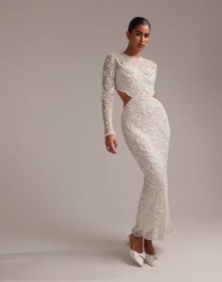 Dresses by ASOS DESIGN Faux-pearl embellishment Round neck Long sleeves Cut-out waist Secure back fastenings Kick split Slim fit This product has been hand embellished Due to this process it's delicate and the design may vary