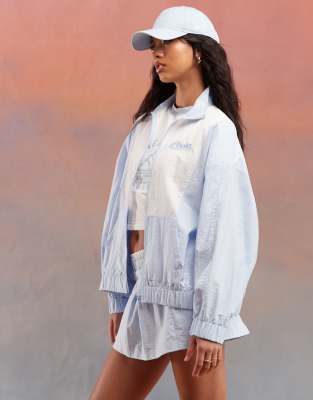 Coats & Jackets by ASOS WEEKEND COLLECTIVE Part of a co-ord set T-shirt and skort sold separately High collar Zip fastening Branded embroidery and print Side pockets Oversized fit
