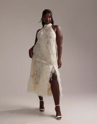 Dresses by ASOS Curve Bead embellishment Halterneck style Button and zip-back fastening Side split Faux-feather hem Regular fit This product has been hand embellished Due to this process it's delicate and the design may vary