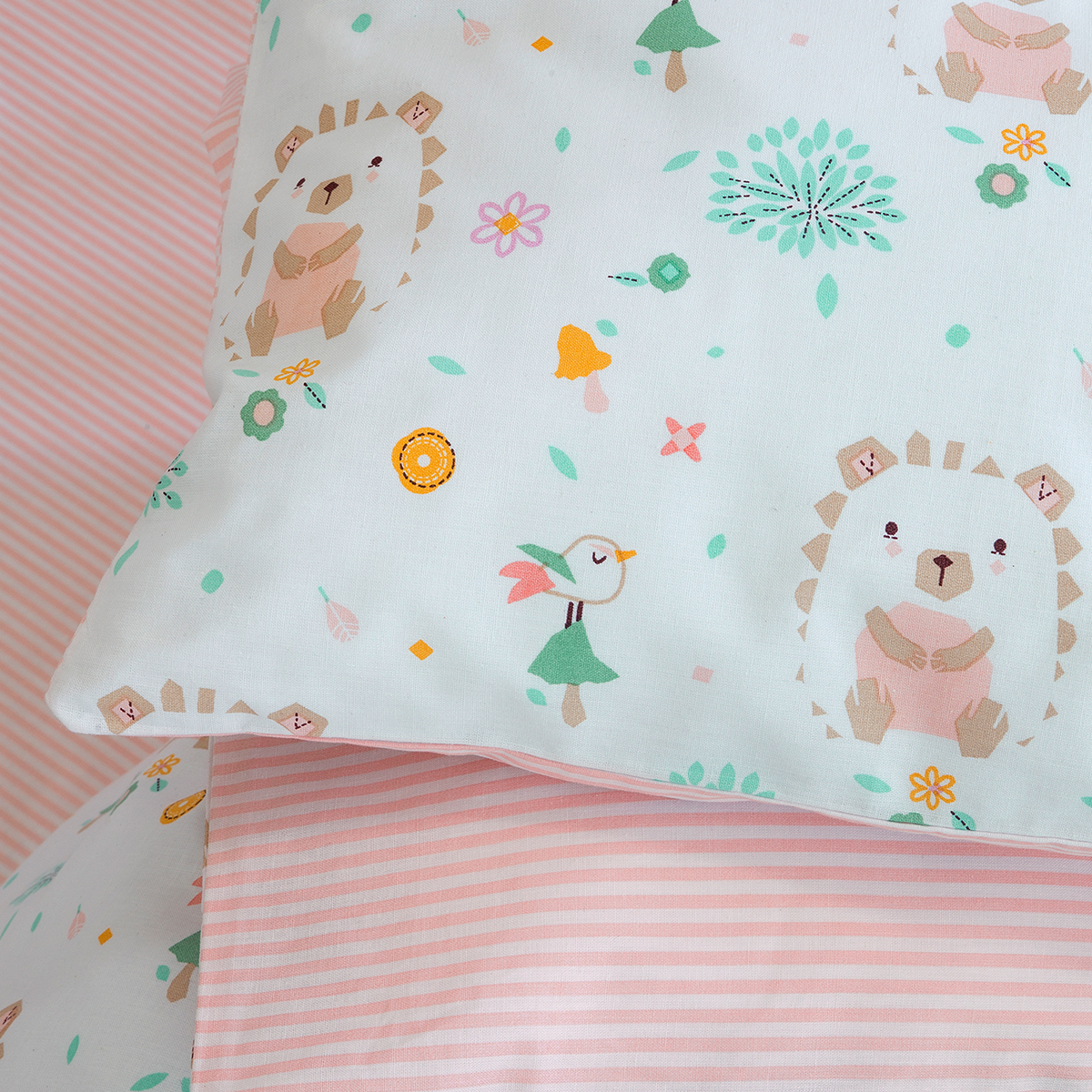 Βρεφικό κουβερλί για την κούνια από την εταιρεία Nima με σχέδιο ζωάκια. Το εξωτερικό ύφασμα είναι 100% βαμβάκι 144 κλωστών, απαλό και ανθεκτικό ενώ εσωτερικά έχει λεπτή πολυεστερική βάτα. Το φόντο είναι λευκό με ροζ-πολύχρωμες λεπτομέρειες. Η μία μεριά του έχει το σχέδιο του πανωσέντονου και η άλλη το σχέδιο του κατωσέντονου. Ιδανικό για τους ανοιξιάτικους και καλοκαιρινούς μήνες. Διατίθεται σε υφασμάτινη συσκευασία.