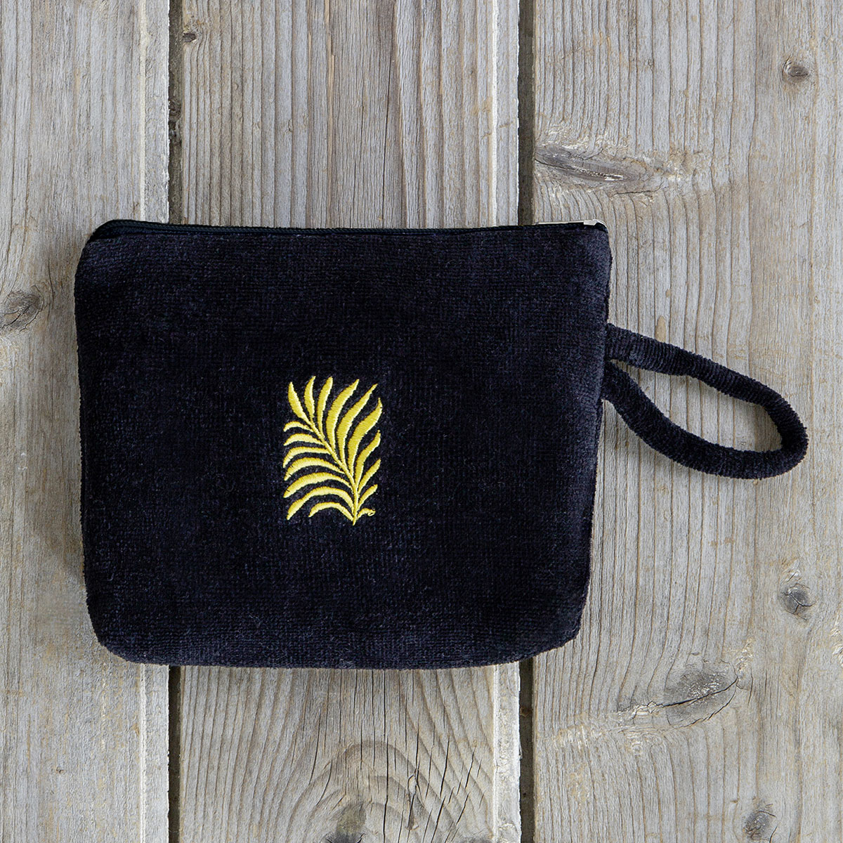 Τσαντάκι παραλίας από την εταιρεία Nima σε μαύρο χρώμα με κίτρινο κέντημα. Το εξωτερικό ύφασμα είναι πετσετέ από 100% βαμβάκι και διαθέτει εσωτερική αδιάβροχη επένδυση. Έχει θηλάκι για εύκολο κράτημα. Συνδυάστε το με τα υπόλοιπα είδη θαλάσσης της ίδιας συλλογής.