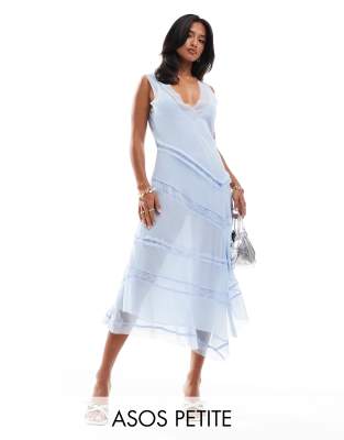 Petite by ASOS Petite Occasions made easy Plunge neck Sheer panels Raw edges Lace inserts Dipped hem Regular fit