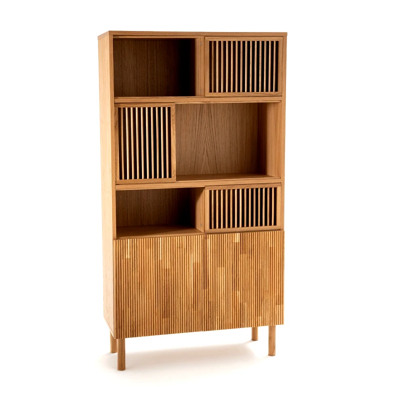 Ντουλάπα βιβλιοθήκη Bilbao. Μια μοντέρνα βιβλιοθήκη με γεωμετρικές γραμμές και προσόψεις από μασίφ ξύλο δρυ. Απόλυτα λειτουργική, ξεχωρίζει για τους πολλούς αποθηκευτικούς χώρους. Ευρωπαϊκής κατασκευής.Περιγραφή: - Πλαίσιο, ράφια από πλαίσια μοριοσανίδας με καπλαμά ξύλου δρυ και βερνίκι νιτροκυτταρίνης - Πλάτη από MDF με καπλαμά ξύλου δρυ - 3 συρόμενες πόρτες με κάγκελα από μασίφ ξύλο δρυ - 2 πόρτες με ημικυλινδρικές ραβδώσεις από μασίφ ξύλο δρυ - Μεντεσέδες με σύστημα «soft closing» - 6 χωρίσματα αποθήκευσης - Πόδια από μασίφ ξύλο δρυ - Σημείο επιτοίχιας στήριξης - Ευρωπαϊκής κατασκευήςΔείτε όλα τα είδη της σειράς Bilbao στο laredoute.gr Διαστάσεις:Συνολικές διαστάσεις: - Πλάτος: 90 εκ. - Ύψος: 168 εκ. - Βάθος: 37 εκ. - Ύψος ποδιών: 18 εκ.Ωφέλιμες διαστάσεις χωρισμάτων: - Ωφέλιμες διαστάσεις των χωρισμάτων με πόρτες (ρυθμιζόμενα ράφια): Π42,5 x Υ46 x Β35 εκ. - Ωφέλιμες διαστάσεις επάνω χωρισμάτων: Π44,5 x Υ30 x Β35 εκ. + Π38 x Υ30 x Β35 εκ. - Ωφέλιμες διαστάσεις μεσαίων χωρισμάτων: Π28 x Υ40 x Β35 εκ. + Π56,5 x Υ40 x Β35 εκ. - Ωφέλιμες διαστάσεις κάτω χωρισμάτων: Π46,5 x Υ25 x Β35 εκ. + Π38 x Υ25 x Β35 εκ.Η βιβλιοθήκη Bilbao συναρμολογείται από τον πελάτη. Διαστάσεις και βάρος συσκευασίας: 3 δέματα - Μ105 x Υ11 x Β57 εκ., 14 kg - Μ111 x Υ16 x Β42 εκ., 19,5 kg - Μ163 x Υ11 x Β42 εκ., 23,2 kg