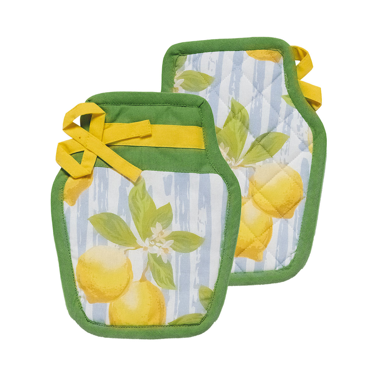 Πιάστρες κουζίνας από την εταιρεία Kentia σε πράσινο-κίτρινο χρώμα με γαλάζιες-εκρού λεπτομέρειες και λεμόνια στο σχέδιο. Εξωτερικά είναι κατασκευασμένες από 100% βαμβάκι. Εσωτερικά διαθέτουν βάτα βάρους 200gsm που προστατεύει από ανεπιθύμητα καψίματα στην κουζίνα.