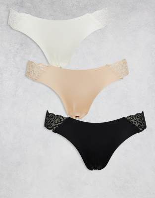 Lingerie & Nightwear by Cotton:On Pack of three Low rise Elasticated waist Lace inserts Brazilian cut