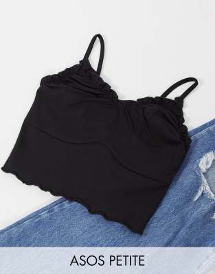 Petite top by ASOS DESIGN An easy wardrobe win V-neck Cami straps Seam detail to bust Lettuce trim Cropped length Slim fit A close-fitting cut