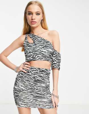 Top by Fashionkilla Part of a co-ord set Skirt sold separately Zebra design One-shoulder style Cut-out panel Cropped length Slim fit