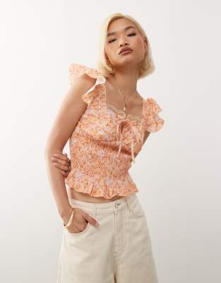 Tops by Reclaimed Vintage Floral design Square neck Lace trim Frill sleeves Regular fit