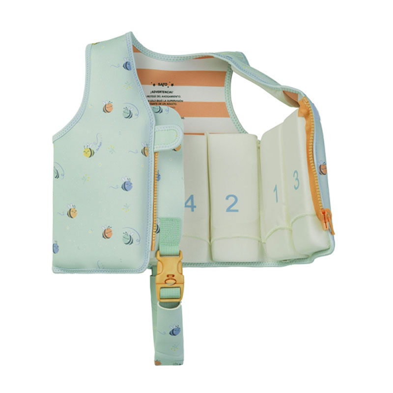Παιδικό γιλέκο κολύμβησης από την εταιρεία Saro σε βεραμάν χρώμα με μελισούλες στο σχέδιο. Είναι κατασκευασμένο από 90% νεοπρένιο και 10% polyester. Διαθέτει 8 κομμάτια επίπλευσης που μπορούν να αφαιρεθούν σιγά σιγά καθώς βελτιώνεται η ικανότητα του μικρού σας να επιπλέει χωρίς βοήθεια, απολαμβάνοντας την παραλία ή την πισίνα και εγγυάται την ασφάλειά του. Επίσης διαθέτει ρυθμιζόμενο λουράκι με επένδυση και ασφαλές κλείσιμο για να μπαίνει ανάμεσα στα πόδια, ώστε το γιλέκο να παραμένει στη θέση του και να μην γλιστράει πάνω από το κεφάλι του ενώ παίζει στο νερό. Είναι ευχάριστο και απαλό στην αφή, καθιστώντας το πολύ άνετο στη χρήση. Είναι κατάλληλο για παιδιά 1-3 ετών και βάρος 9-18 κιλά. *Προσοχή! Για την ασφάλεια του παιδιού σας, μην το αφήνετε χωρίς επίβλεψη. Αυτό είναι ένα βοήθημα επίπλευσης και όχι σωσίβιο*