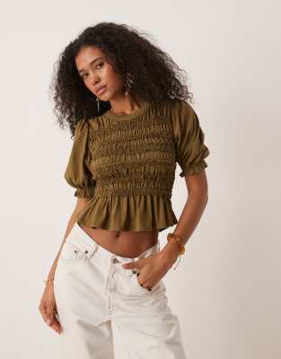 Tops by Free People Round neck Puff sleeves Shirred bodice Peplum hem Regular fit