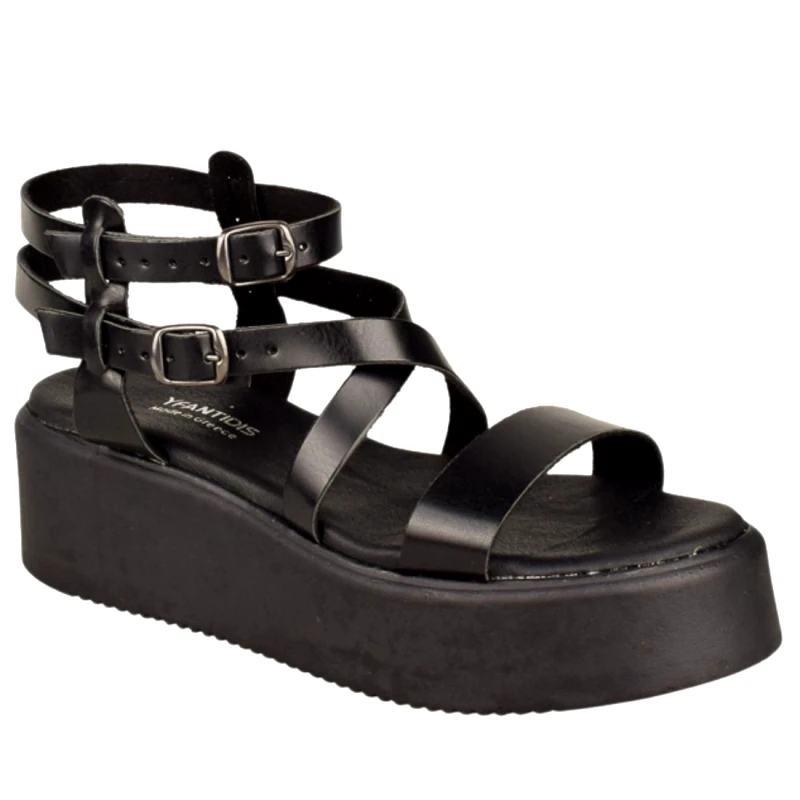 Αυτό το ζευγάρι γυναικεία πέδιλα πλατφόρμες Υφαντίδης, σε κλασικό μαύρο χρώμα, αποτελεί μια δυναμική και στιλάτη επιλογή για τις καλοκαιρινές εμφανίσεις σας . Ο σχεδιασμός τους είναι εμπνευσμένος από τα gladiator sandals, με πολλαπλά λεπτά λουράκια που αγκαλιάζουν το πόδι και τον αστράγαλο, ρυθμιζόμενα με κομψές μεταλλικές αγκράφες. Η χοντρή, ενιαία πλατφόρμα όχι μόνο προσδίδει εντυπωσιακό ύψος και μια σύγχρονη, edgy αίσθηση, αλλά και εξασφαλίζει άνετο και σταθερό πάτημα, ιδανικό για πολύωρη χρήση. Είναι ένα ζεύγος σανδάλια που συνδυάζει άψογα την άνεση με το μοντέρνο στυλ, καθιστώντας το ιδανικό για βραδινές εξόδους, συναυλίες ή για να προσδώσετε μια ξεχωριστή νότα στις καθημερινές σας εμφανίσεις.