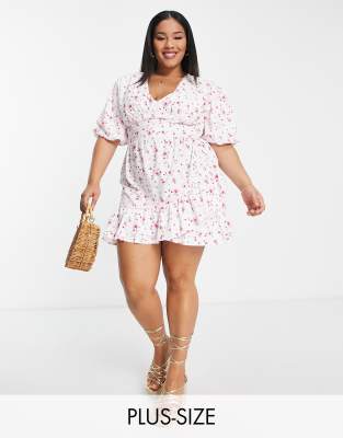 Plus-size dress by In The Style Collaboration with influencer Perrie Sian Floral print Wrap front Puff sleeves Frill hem Regular fit