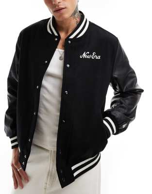Επισκέψου το κατάστημα Asos για να δεις περισσότερες λεπτομέρειες και φωτογραφίες για το New Era script logo varsity style bomber with PU contrast sleeves in black. Για αγορά του New Era script logo varsity style bomber with PU contrast sleeves in black πρέπει να επισκεφτείς το κατάστημα Asos.