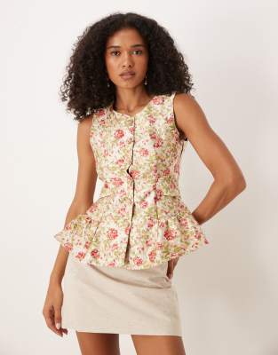 Tops by sister jane Floral design Round neck Button placket Sleeveless style Peplum hem Slim fit