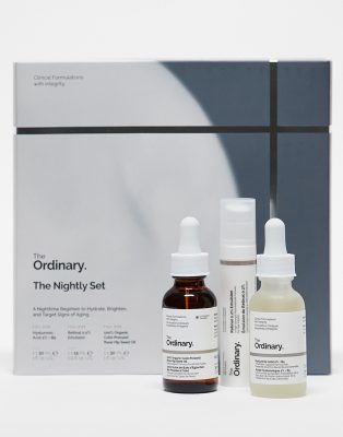 Face + Body by The Ordinary For your self-care shelf The Ordinary Nightly Set Contains rose hip seed oil retinol emulsion and hyaluronic acid formula Hyaluronic Acid 2% + B5 Next Generation formula aims to replenish skin’s hydration levels and helps the skin retain moisture to replump dry dehydrated skin 100% Cold-Pressed Rose Hip Seed Oil is designed to brighten and balance uneven skin tone support skin elasticity and leave skin looking supple and radiant Retinal 0.2% Emulsion Serum works to firm smooth and reduce the appearance of dark spots and wrinkles Presented in a branded gift box Product is non-returnable for hygiene reasons