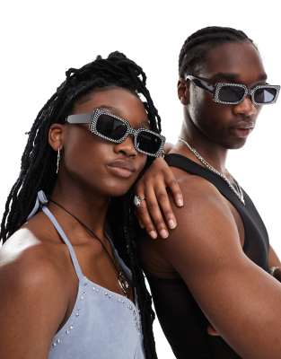 Accessories by AJ Morgan Iconic accessory status Diamante embellishment Rectangular frames Moulded nose pads Dark-tinted lenses Slim arms Unisex style