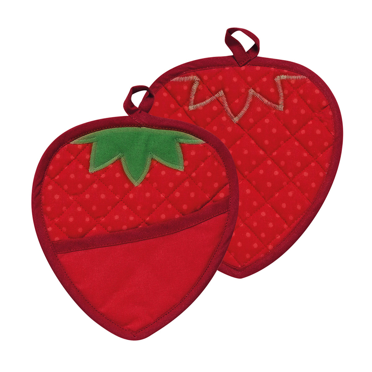 Πιάστρες κουζίνας από την εταιρεία Kentia σε κόκκινο χρώμα με πράσινες λεπτομέρειες και σχήμα φράουλας. Εξωτερικά είναι κατασκευασμένες από 100% βαμβάκι. Εσωτερικά διαθέτουν βάτα βάρους 200gsm που προστατεύει από ανεπιθύμητα καψίματα στην κουζίνα.