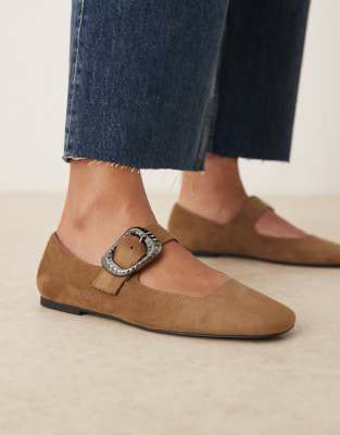 Shoes by ASOS DESIGN Pin-buckle fastening Adjustable strap Hammered buckle finish Almond toe Flat sole
